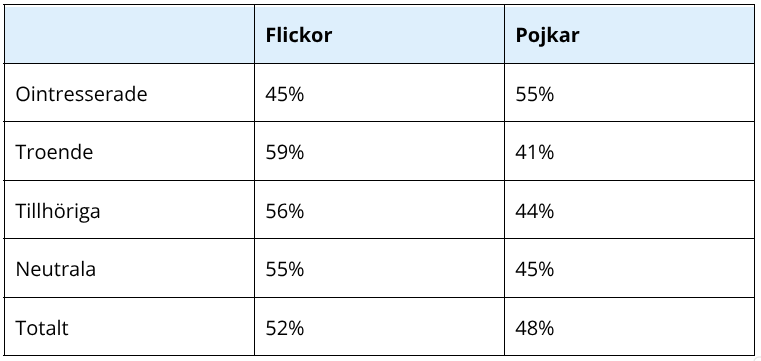 En mindre grupp (20%) kÀnner bÄde att de tillhör en religion och att de verkligen tror pÄ den. Och sÄ finns det de som Àr neutrala (18%), de tar varken avstÄnd frÄn religion eller Àr speciellt intresserade.