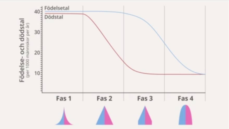 När industrialiseringen tar fart, som i Sverige under 1800-talet, börjar dödstalen att sjunka. Jordbruket utvecklas, tekniken förbättras och man börjar vaccinera mot sjukdomar. Hygienen blir bättre, vilket minskar risken för smitta. Födelsetalen är fortfarande höga, vilket leder till en snabb befolkningstillväxt.