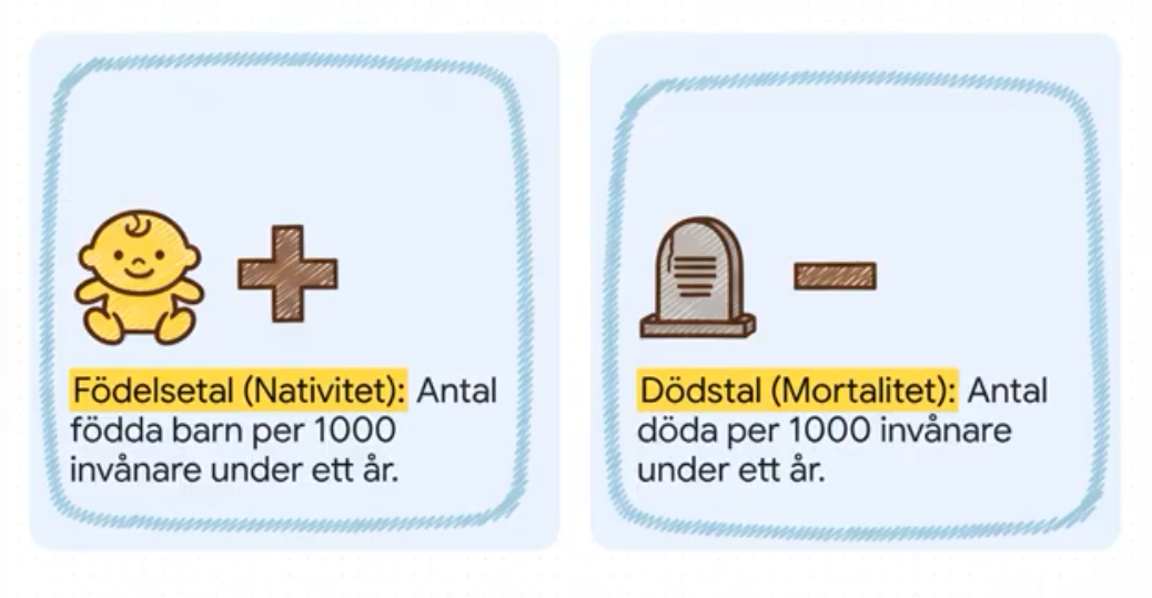- Naturlig folkökning: Skillnaden mellan födelsetal och dödstal. Om födelsetalet är högre än dödstalet ökar befolkningen. Om dödstalet är högre minskar befolkningen.