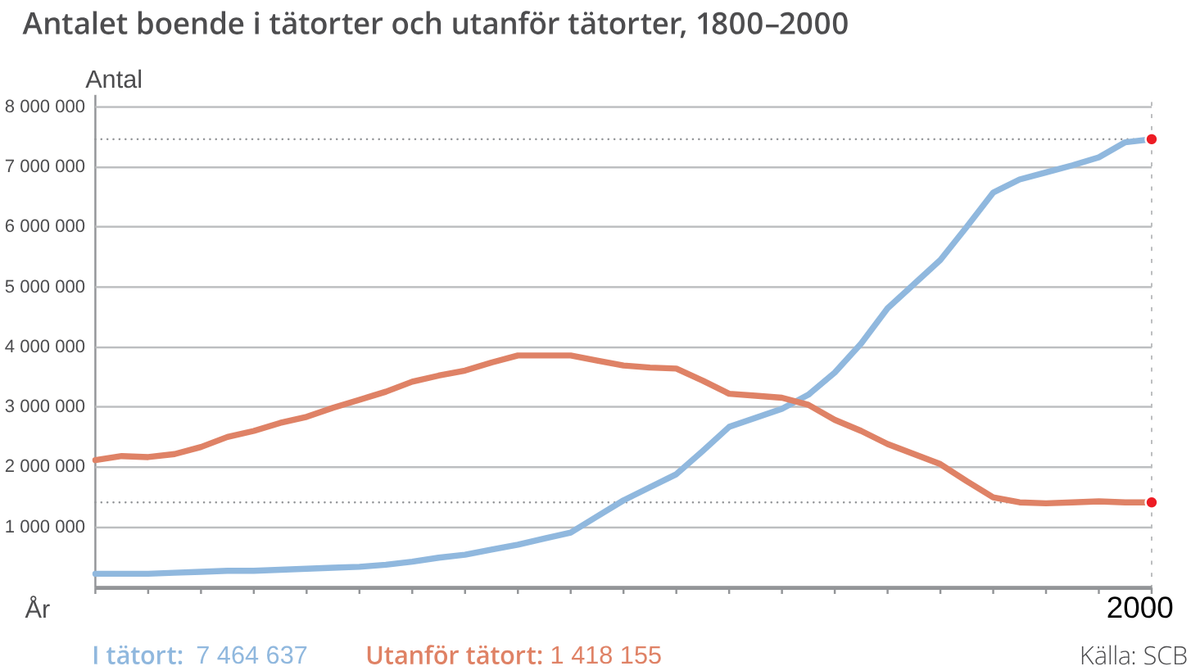 - FrÄn landsbygd till stad: För 200 Är sedan bodde majoriteten av svenskarna (90 %) pÄ landsbygden. Idag Àr situationen nÀstan omvÀnd, med 85 % boende i tÀtorter. Denna urbanisering startade under industrialiseringen pÄ 1800-talet, dÄ mÀnniskor sökte sig till stÀderna för att hitta arbete.